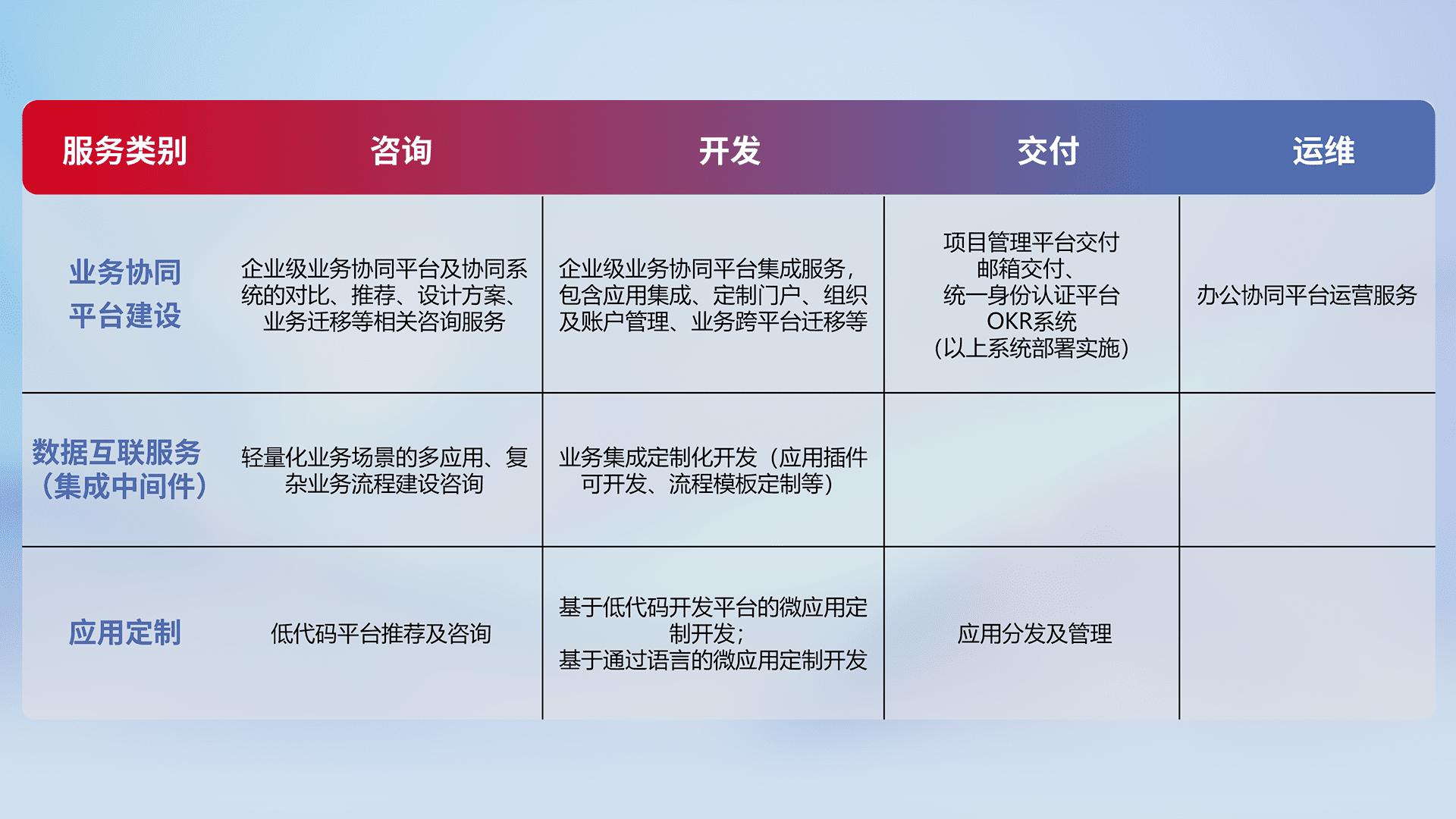 针对钉钉、、、企微、、、、IDaas等平台级产品提供产品的规划、、、方案、、、、交付、、、定制化开发等服务,,,实现如统一协同办公、、、智能客户服务、、混合会议管理、、、智能数据查询、、、、等业务场景,,,,实现数字化转型。。。。